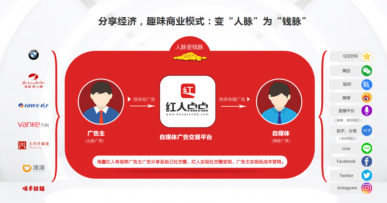 红人点点是一个致力于社交资源共享的数字化媒体营销交易平台,已拥有超500万自媒体红人资源,9.2亿粉丝受众,并整合微信朋友圈、微信公众大号、微博、QQ空间等资源,为商家、用户、投资商带来新模式、新产业及新趋势。