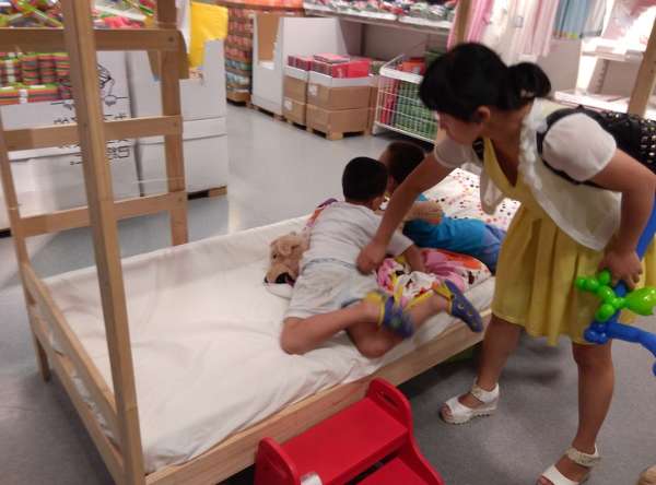 宜家蹭清凉的人 6日中午,宜家的客流量并不少,在舒适明亮的躺椅展示区内,就有这样一群蹭坐蹭睡蹭清凉的人。漂亮的小姑娘刚起床小朋友在床上嬉戏双人情侣沙发也是可以睡很香的