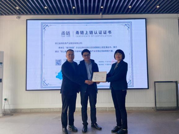 图为宁波市经信局屠炯副局长向“海河智链”团队颁发“甬链”上链证书