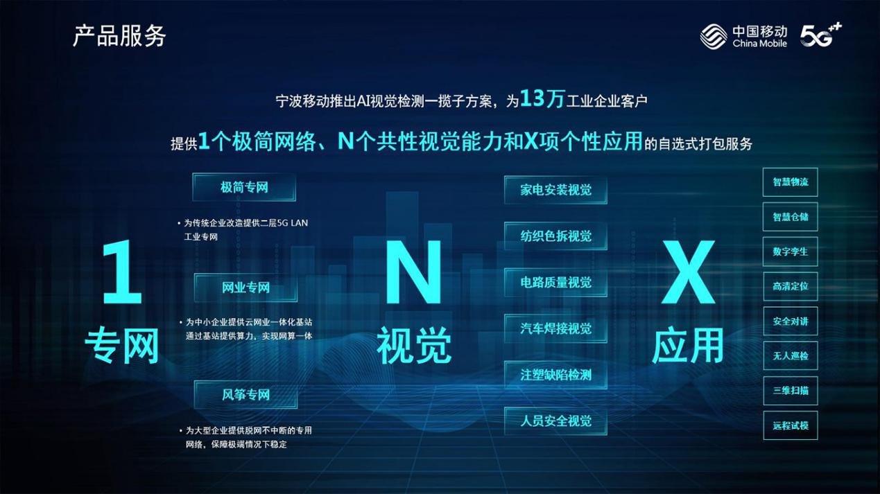 宁波移动推进网络的智能化,实现网络的能力开放化,能够更加灵活便捷的搭建网络架构和能力匹配,并结合行业特性落地了融合专网、集群专网、切片专网、入驻专网、流量专网六大专网能力,来满足各行各业的场景和需求,加速5G工业互联网从样板间走向商品房。