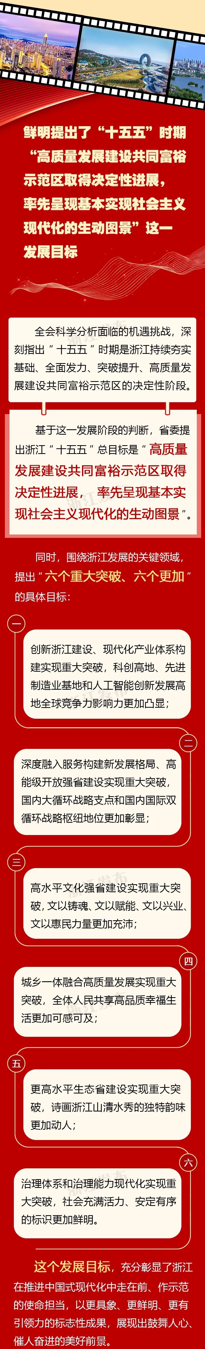 这次全会最重要的成果,就是审议通过了省委关于制定“十五五”规划的《建议》。《建议》全面贯彻落实党的二十届四中全会精神,紧扣习近平总书记赋予浙江的重大使命任务,立足“十五五”浙江发展的方位定位,提出了“十五五”时期浙江发展的指导思想、基本要求、主要目标和重点任务,充分体现了中央的要求、时代的特征、浙江的特色和人民的期盼,是对今后五年全省经济社会发展的总体规划和系统部署。