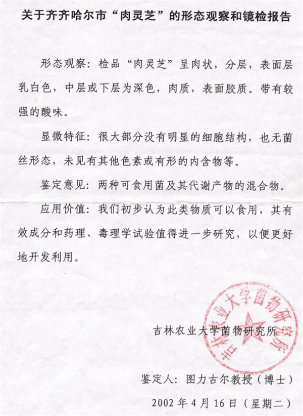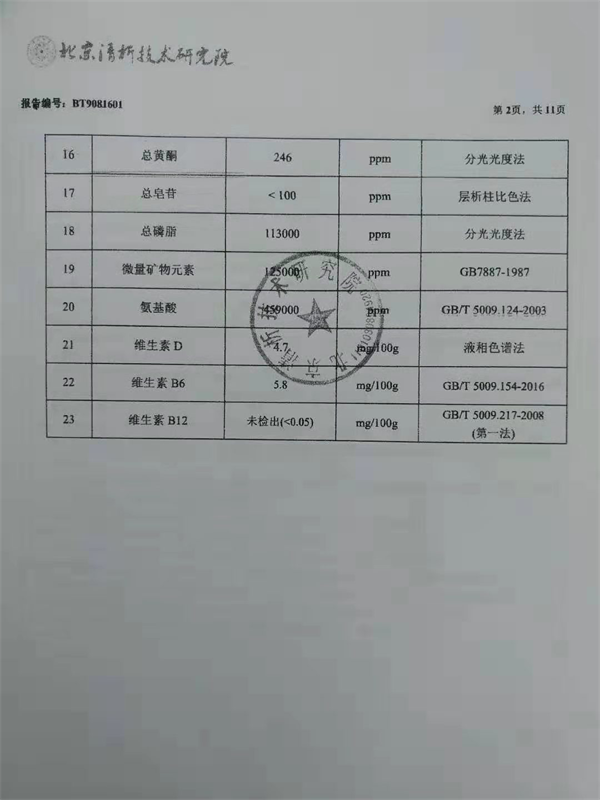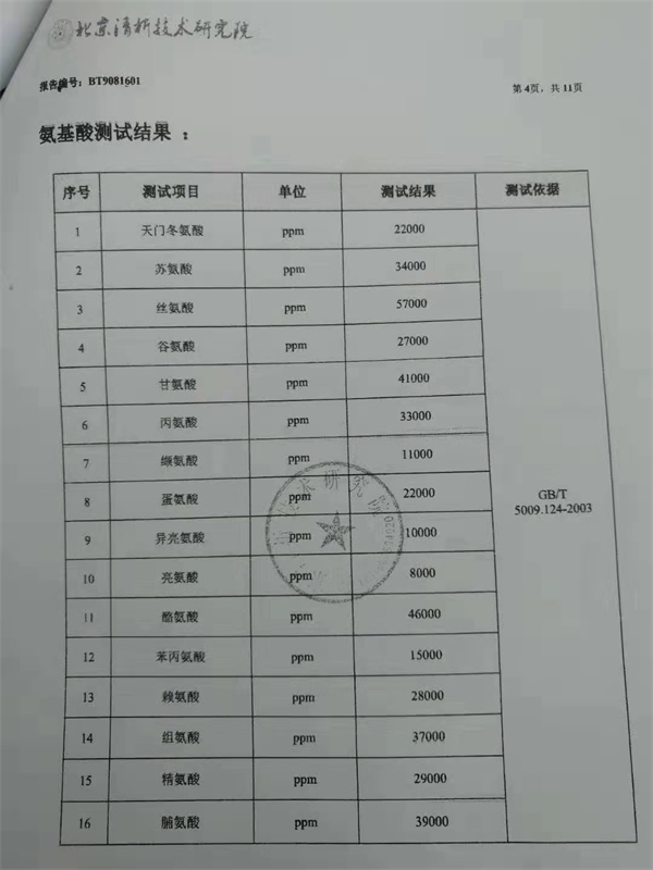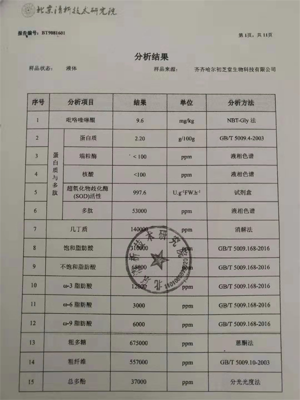 成品出来之后马上送检中国乃至国际上非常具有权威的北京清析技术研究院做各项有效成分的含量检测,检测出的结果更是令翌生美健康医疗集团培养基地的所有人都兴奋不已,里面PQQ吡咯喹啉醌(治疗癌症的法宝)、灵芝酸(降血脂、降血压、助消化)、SOD超氧化物歧化酶(清除自由基、抑制癌细胞)、端粒酶(决定寿命的尺子)、多糖(抗病毒、抗抗癌)等的含量是所有已知生物检测结果的很多倍,还有其他很多种营养物质如:核酸、多肽、几丁质、类黄酮、卵磷脂、蛋白质、各类氨基酸、有机锗、三萜类、维他命、钙钾镁硒等多种矿物元素等,还有几万种粘菌复合体,检测人员称:目前我们对太岁肉灵芝的研究深度不到5%,还需要我们慢慢去研究。