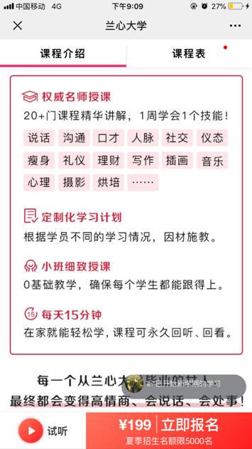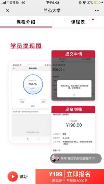 如果你也是不自律的人群之一,兰心大学的千元奖学金计划正是为此应运而生。兰心大学的学费不过199元,但是只要遵守兰心大学的上课规则,如听完兰心大学规划的当日15分钟必修课、即可获1元,免费的选修课每周六更新,当天听完课程获取0.5元,精选好课,需要付费购买的课程,不单独退还学费,当天购买当天即可听课获取0.5元, 期中考试会获取1元,期末考试80分,即可获得2元,邀请好友成为兰心大学校友、即可获得20元,这些奖学金在听课当日就会发放至个人的学习账户中,在累计200元后,即可提现,最高可获得1000元。