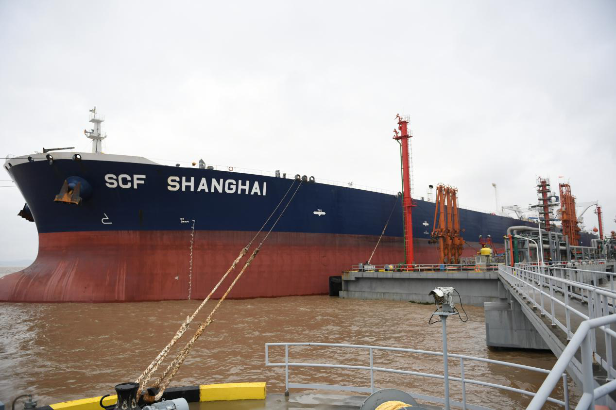 2019年12月24日,载重32万吨的VLCC油轮“大上海号”靠泊宁波大榭中油燃料油30万吨级油码头, 13.6万吨原油顺利输入信海油库。这标志着2019年宁波舟山港大榭港区货物吞吐量突破亿吨大关,迈进港口“亿吨俱乐部”。(宣浩峰摄)