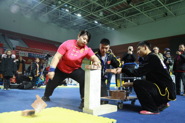 《单项功力赛》采用武术中的劈砸,击破木板多者取胜