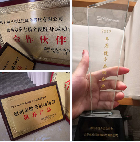 2017年EM Fitness亿迈被评为年度健身品牌企业,成为行业品牌典范。2018年亿迈生产的健身器材成为健身运动协会指定推荐产品,同年亿迈成为“德州市第七届全民健身运动会合作伙伴”为全民健身保驾护航。2019年德州市武术协会授予了亿迈“特别贡献奖”的荣誉,对亿迈的产品表示认可。