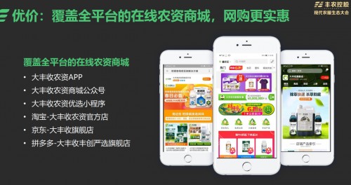 丰农控股旗下大丰收为解决农民农资购买渠道单一、植保服务短缺、大基地管理难,专业检测难等问题逐步发展出大丰收农资商城、基地托管、大丰收植保等多项业务。目前,大丰收已与先正达、巴斯夫、拜耳、金正大、云图控股等200多家知名农资厂商建立合作。