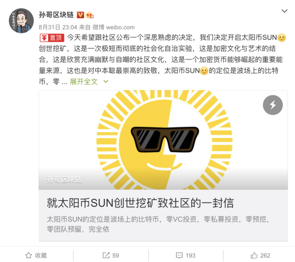 根据著名的“孙迟但到”定律,火热的DeFi挖矿潮,怎么能少了的孙老板,这不,8月31日,他在微博上发表了《就太阳币SUN创世挖矿致社区的一封信》。
