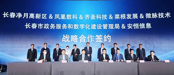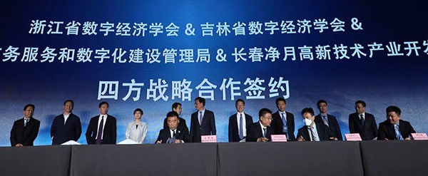 活动中,吉林省社会科学界联合会副主席、吉林省社会科学院党组书记、院长王颖宣读《关于同意成立吉林省数字经济学会的审查意见》;吉林省民政厅厅长、党组书记乔恒宣读《吉林省民政厅关于同意成立吉林省数字经济学会的批复》,标志着吉林省数字经济学会正式成立。浙江省数字经济学会、净月高新技术产业开发区、长春市政务服务和数字化建设管理局、吉林省数字经济学会进行“四方战略合作”签约;净月高新技术产业开发区分别与凤凰数字科技有限公司、杭州齐圣科技有限公司、浙江菜根科技产业发展有限公司、微脉技术有限公司四家企业进行战略合作签约;长春市政务服务和数字化建设管理局与杭州安恒信息技术股份有限公司进行战略合作签约。