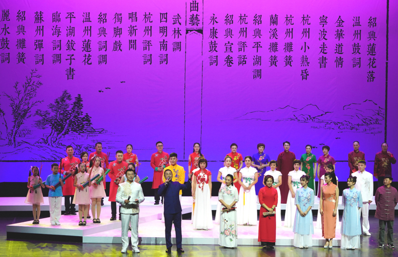在音乐快板《新时代,新发展,曲艺传承新担当》精彩表演中,2020全国非遗曲艺周闭幕式暨“浙江好腔调”曲艺专场演出今天(13日)晚上在天然舞台举行,与开幕式上展演的“蒙语说书”乌力格尔、苏州弹词、北京评书、山东琴书等不同,这一次是省内非遗曲艺同台争艳。