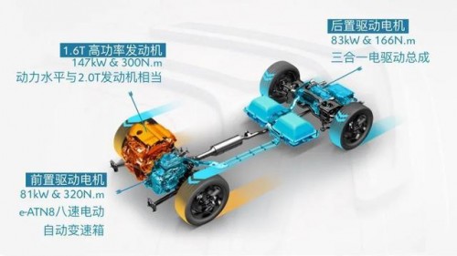 引擎是一台1.6升涡轮增压,结合前后电机综合最大功率可达300马力,扭矩来到520牛·米,百公里加速仅需7秒。各动力单元的工作效率也有不同,如电量充足的情况下,后电机效率最高,前电机次之,引擎的效率最低。