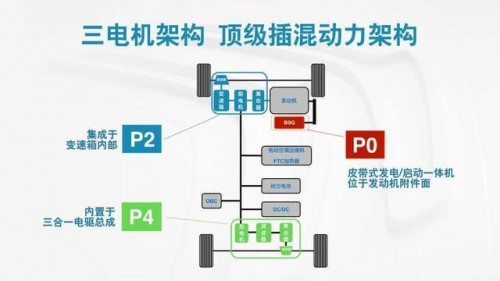 P2架构是前电机集成于爱信ATN8变速箱内部,组成电动8挡自动变速箱,可实现纯电驱动,也可以与引擎实现混合动力。