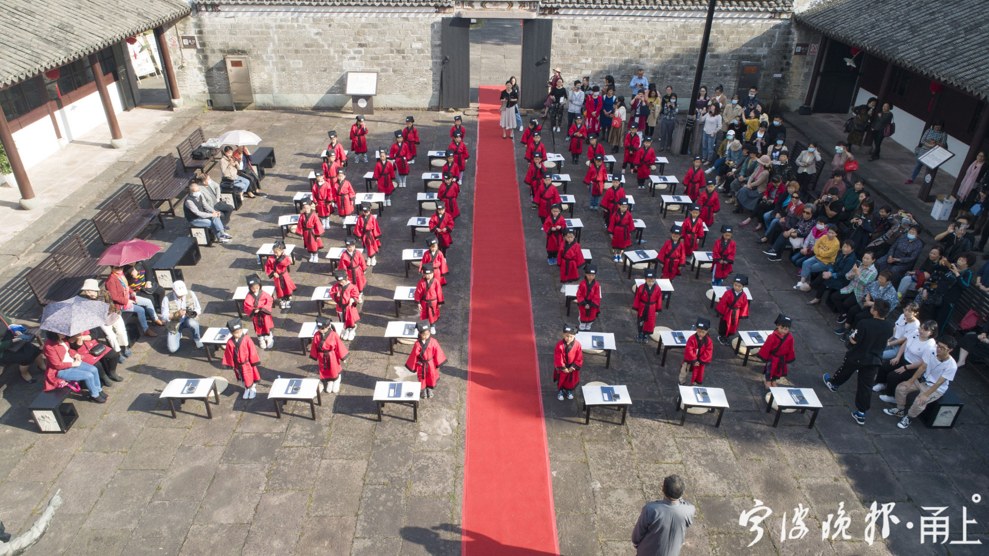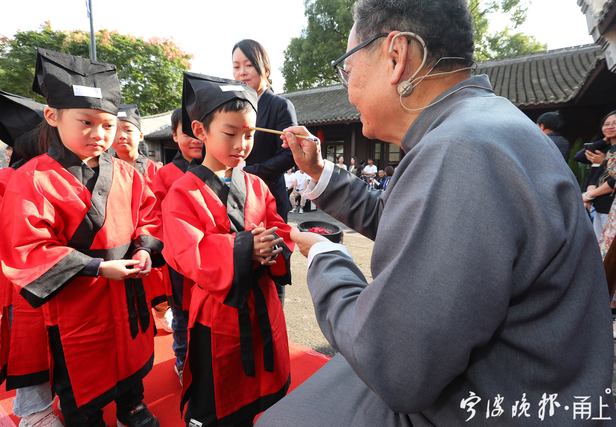 作为第三届“宁波帮”文化节的重要活动之一,“开笔礼”大典上,近50名镇海实验小学一年级学生持立正姿势,依次进行正衣冠言行、朱砂启智、敲钟明智、开笔习书与国学启蒙,以启蒙智慧、塑造美德,教育学业初始的蒙童尊师重道、学会感恩。自2009年起,江南第一学堂已开办11届“开笔礼”,成为蒙童学习传统文化、感受宁波帮精神的良好载体。