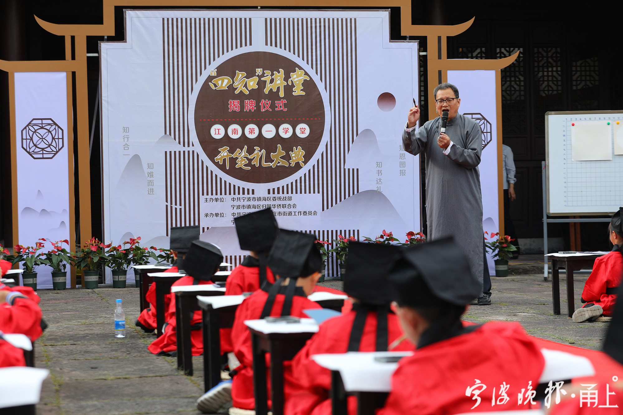 朱砂启智,开笔启蒙。10月27日下午,时值第三届世界“宁波帮•帮宁波”发展大会之际,“四知”讲堂揭牌仪式暨江南第一学堂“开笔礼”大典活动举行。市侨联党组成员、副主席鲁爱丽,镇海区委常委、统战部部长唐东海共同为落户江南第一学堂的全市首个“四知”讲堂揭牌,镇海区政协副主席严红霞为文“话”商帮宣讲团授旗。