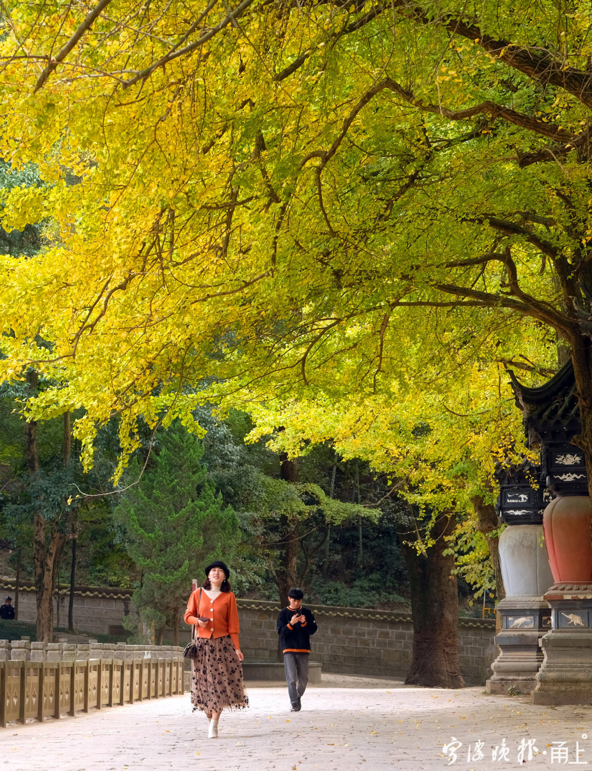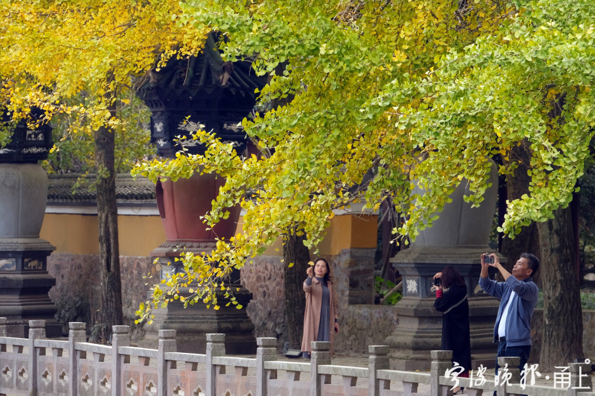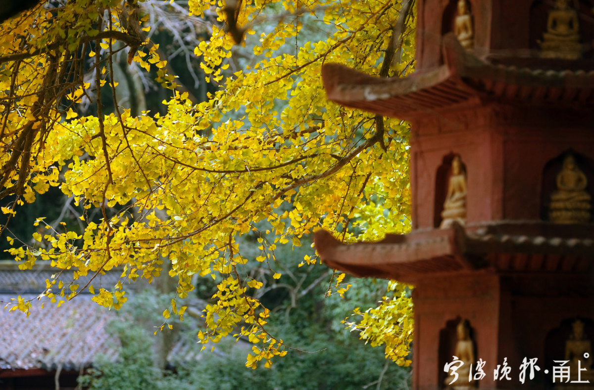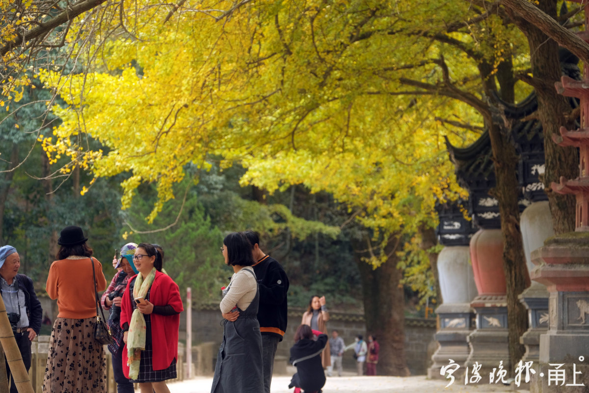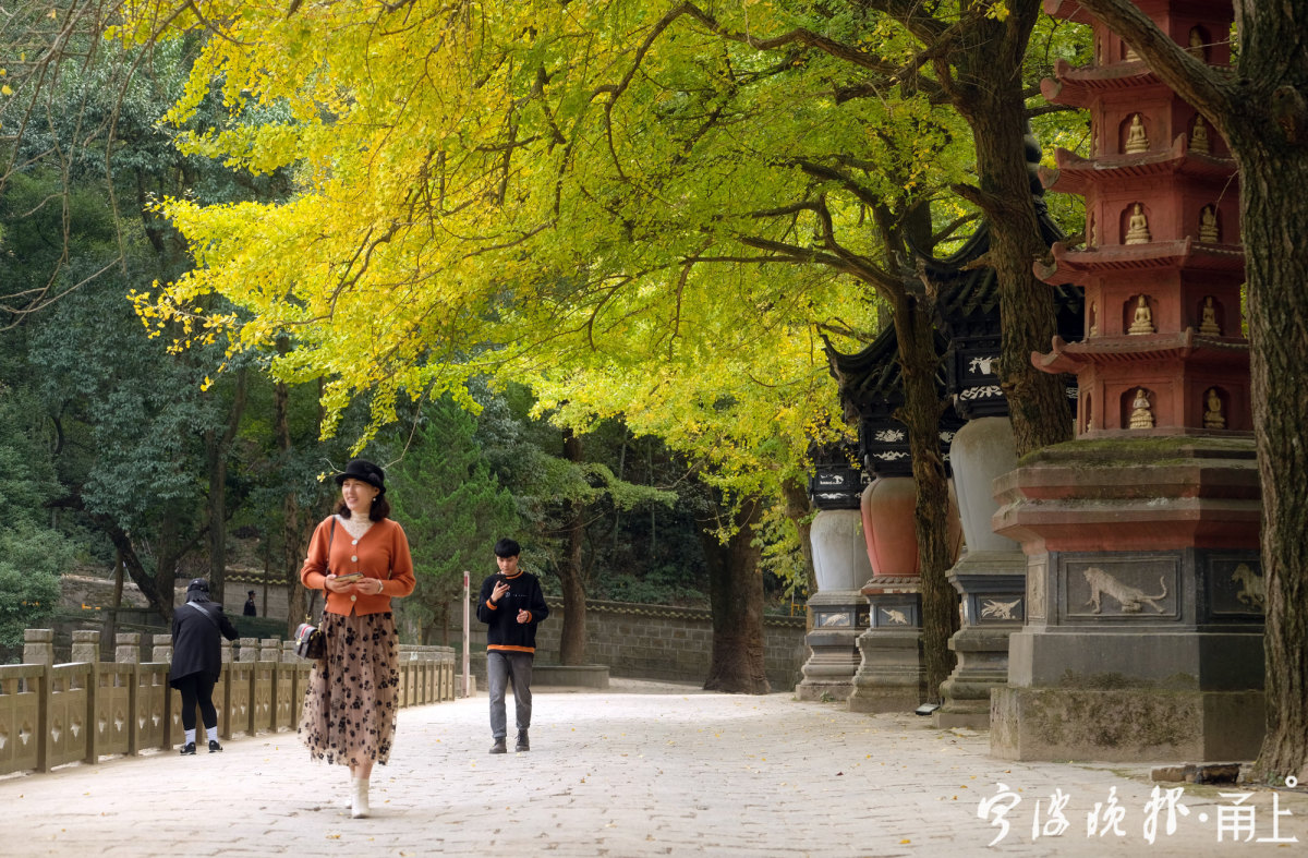 在许多人印象中,天童寺秋色最惊艳之处,莫过于万工池面前的一排古银杏树。每年秋季,总会引来一波波慕名前来的游客驻足观赏,尤其在古银杏落叶时光,纷纷扬扬的黄叶飘在古塔,又洒落在石板的地面,给人多了几分深秋的禅意。