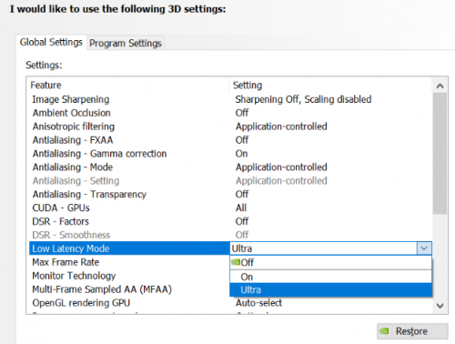 此外,如果游戏不支持NVIDIAREFLEXSDK,玩家仍可以通过从 NVIDIA 控制面板启用 NVIDIA 超低延迟模式来获得一定的延迟改善。只需打开NVIDIA控制面板并导航到管理 3D 设置,然后依次选择“低延迟模式”、“Ultra”选项即可。如前文所述,这将有助于降低渲染延迟,但效果要略弱于游戏本身支持NVIDIA REFLEX SDK。