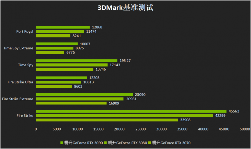 耕升GeForce RTX 30系列全系显卡的理论性能成绩,这里使用的是显卡跑分软件“3DMark”的各项基准测试。从结果来看,耕升GeForce RTX 3090显卡领先耕升GeForce RTX 3080显卡整体性能约11%~13%,领先耕升GeForce RTX 3070显卡整体性能约33%~36%;而耕升GeForce RTX 3080显卡则领先耕升GeForce RTX 3070显卡整体性能约20%~22%的水平;3款显卡也分别对应了RTX 3090 @8K游戏性能、RTX 3080 @4K游戏性能以及RTX 3070 @2K游戏性能!