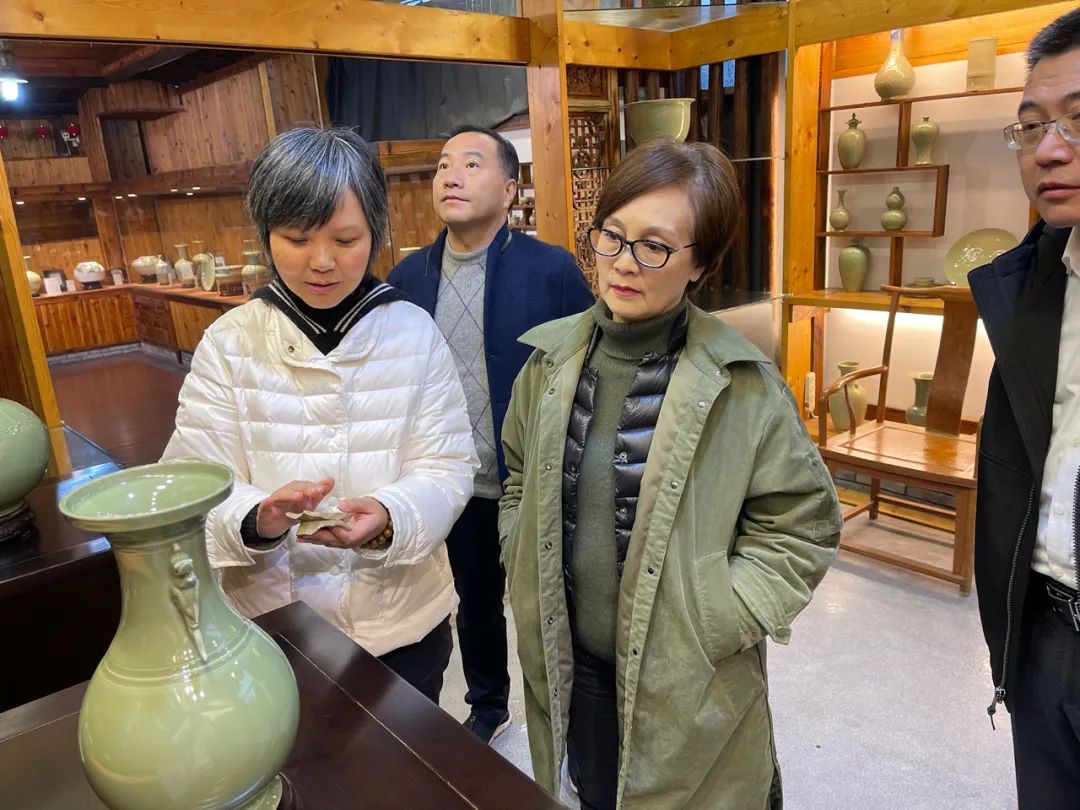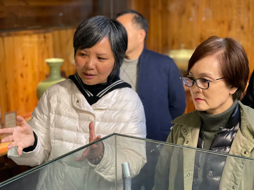 陈瑶一行参观了工作室的各展示区,施珍分享了自己的艺术创作及一路走来的感受与历程。看到施珍一件件获奖作品,陈瑶对施珍多年来持之以恒传承越窑青瓷文化,专心研究提升艺术造诣给予肯定。
