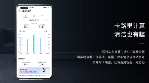 华为智慧生活APP:可通过APP实时显示机器状态,档位变化、剩余电量以及使用者的卡路里消耗,不仅可以合理安排清洁计划,也可以让打扫卫生更有动力!