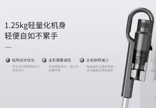 1.25Kg轻量化机身,轻便自如不累手,在结构上对主机内部结构进行优化设计,分体式设计,减少非必要用件,电池电机过滤组件统一分布提高空间利用率,使得整体更加轻便。