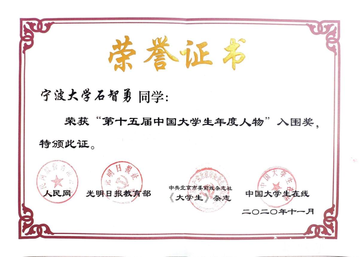 努力总会遇见更好的自己,新年伊始,石智勇收到了“第十五届中国大学生年度人物”入围奖的奖状。
