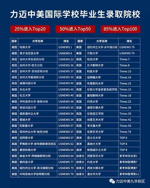 在力迈国际高中,可以与中国乃至世界各地最优秀的同龄人共享资源,也可以从力迈国际高中扬帆远航,目标是五湖汪洋。自2012年开展国际高中课程以来,连续多届毕业生得到了来自世界各地顶尖大学的认可,85%的毕业生拿到了美国前100、英国前20、加拿大前20、澳洲前8的录取。其中不乏考入哈佛、剑桥、加州伯利克、加州洛杉矶、加州欧文、加州戴维斯、波士顿大学、杜伦大学、利兹大学、伦敦艺术大学、多伦多大学、昆士兰大学等名校的优秀学生。