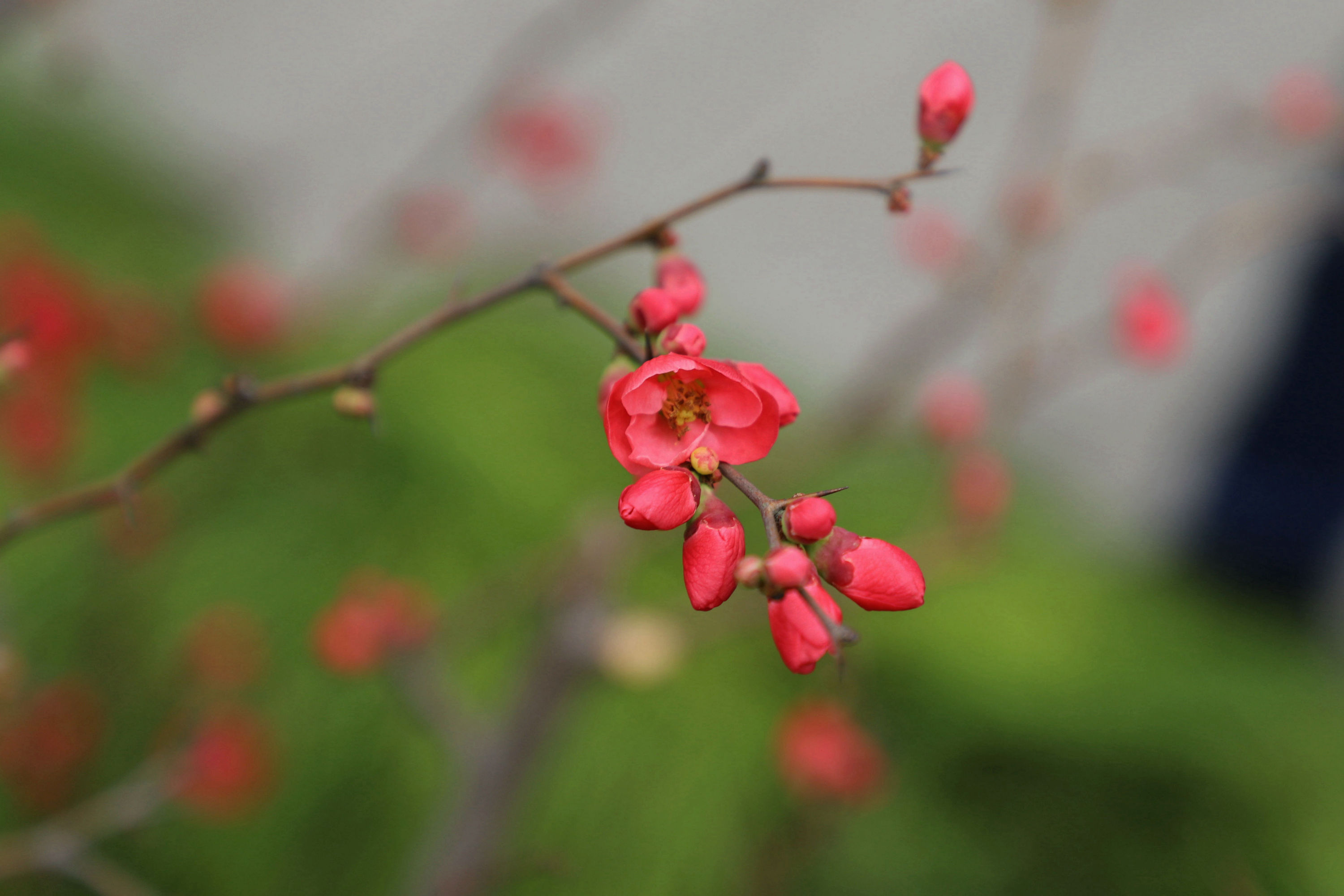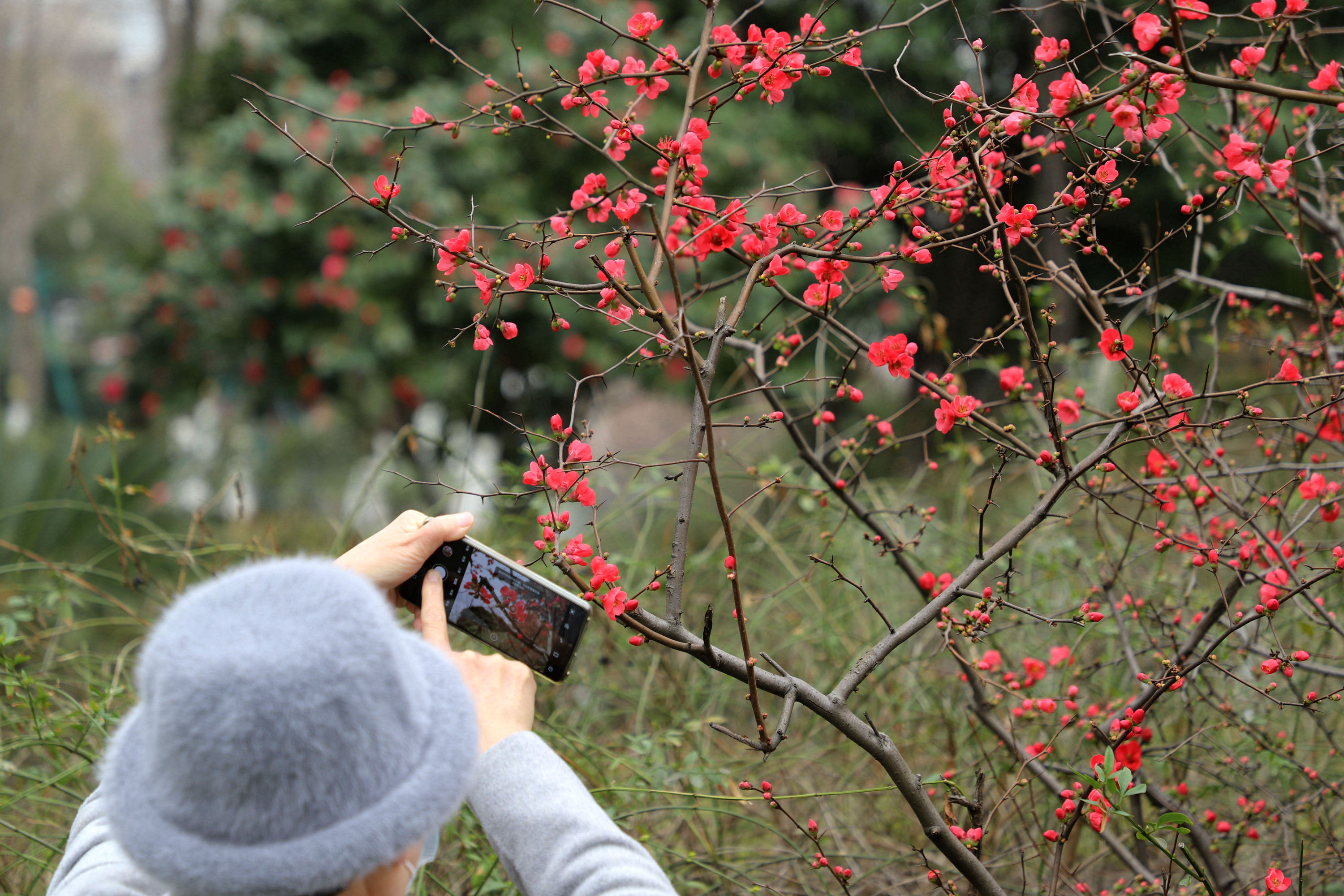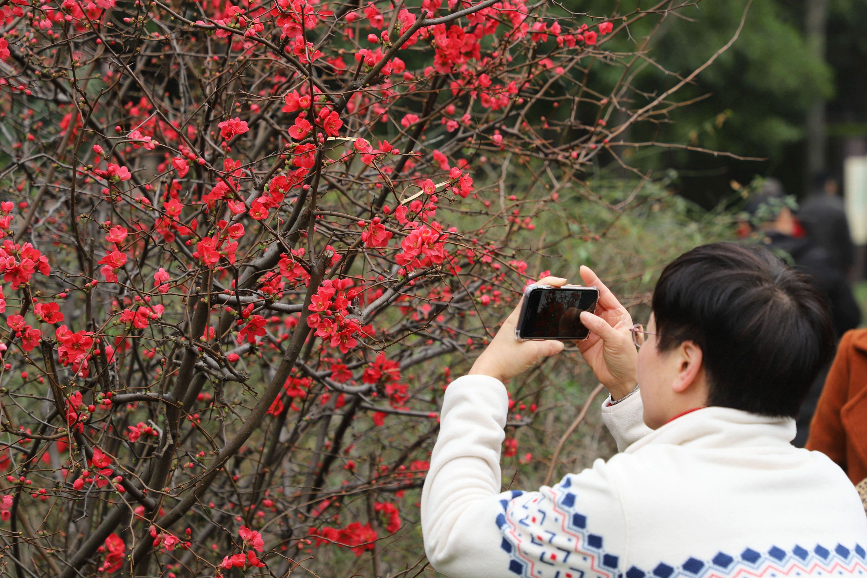 月湖公园里那些株贴梗海棠,在阳光下,正红红火火,妖妍绽放。海棠花素有“国艳”之誉,更有“百花之尊”“花中贵妃”的美称,人们把它看作是美好春天、美人佳丽和事事吉祥的象征。(派粉“东海沙子”/摄)