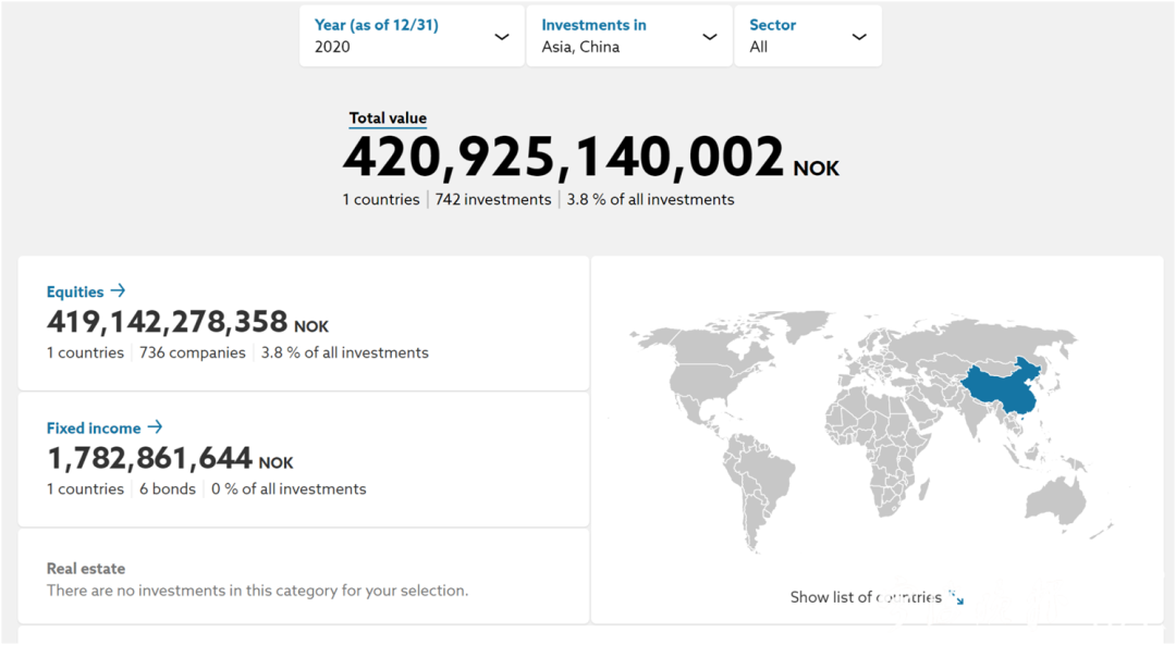 2月25日,全球最大的主权基金——挪威政府全球养老基金(GPFG)的持仓情况全面曝光。截至2020年,该基金的中国股票投资市值达3205亿元,较前一年增加了37.75%,当年投资平均回报率高达29.7%。