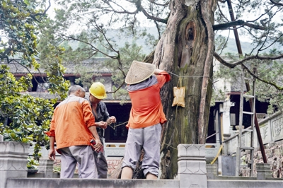 天童寺有一棵唐朝的柏树。1997年,这棵唐柏从2000多株古树中脱颖而出,被评为“宁波十佳古树名木”。然而,古树毕竟年纪大了,去年,它生了一场病,叶片稀疏,枝条腐烂,几近枯死。