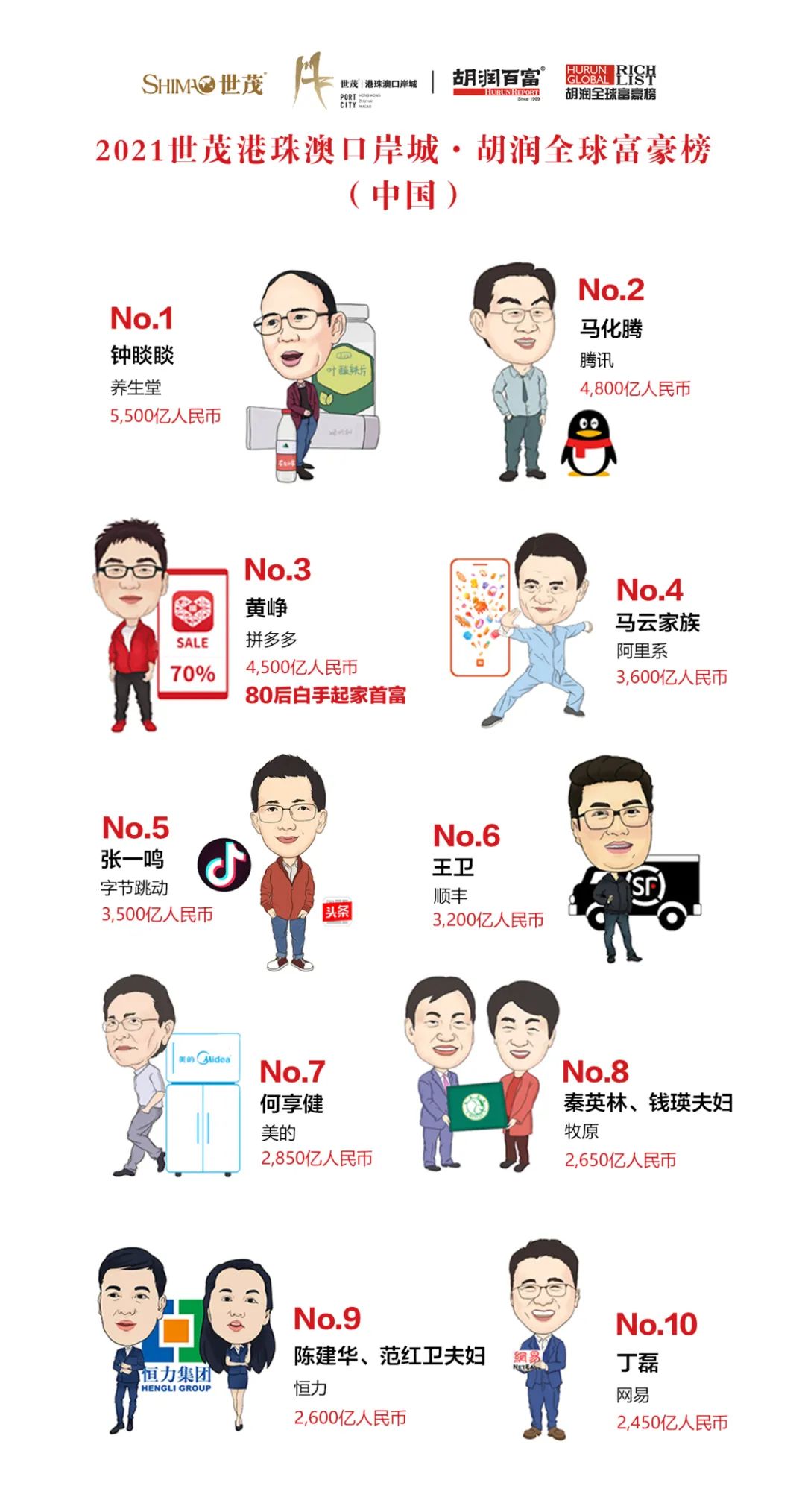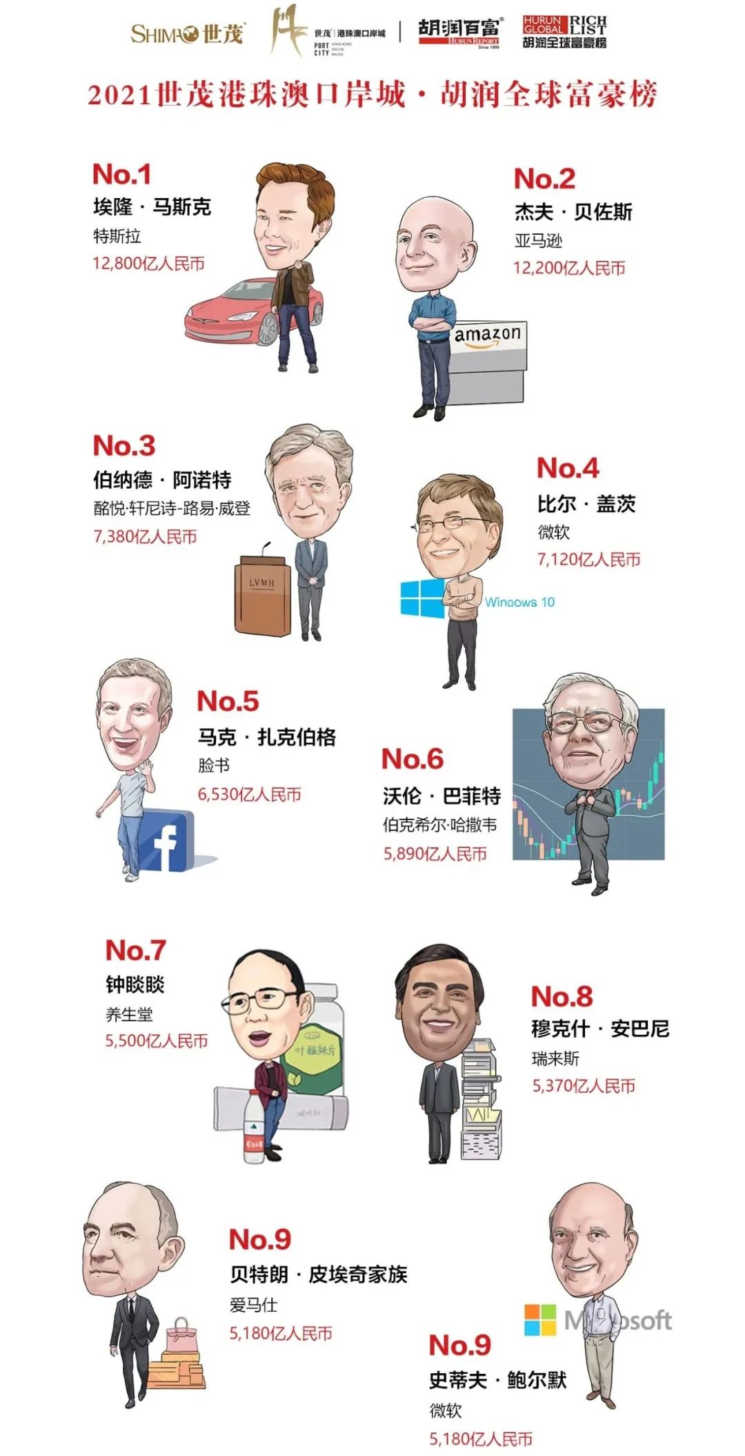埃隆·马斯克凭借特斯拉疯狂上涨的股价登顶世界首富;亚马逊创始人杰夫·贝佐斯位居第二;“奢侈品之王”酩悦·轩尼诗-路易·威登集团(LVMH)董事长伯纳德·阿诺特排名第三;比尔·盖茨退居第四。“瓶装水之王”钟睒睒凭借农夫山泉上市,成为中国首富,排名全球第七。