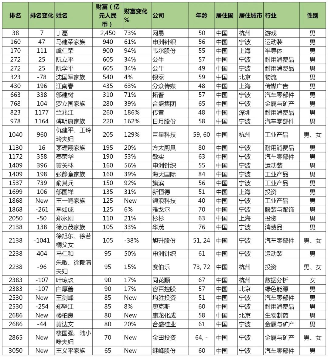 宁波首富仍为丁磊,过去一年,其财富增长73%,达2450亿人民币。紧随其后的是申洲国际的马建荣,去年3月,申洲国际股价一度跌至71.087元,但今年2月11日却创下193元/股的历史新高,目前总市值2473亿元。