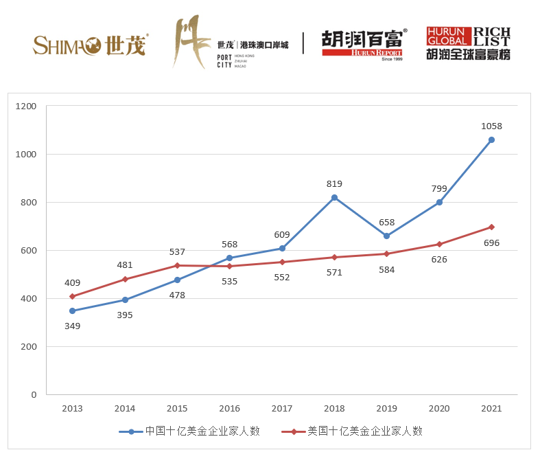 过去一年,中国增加了259位十亿美元企业家,顶级富豪增至1058位,成为世界上第一个拥有超1000位十亿美元企业家的国家。美国排名第二,十亿美元企业家达696位,比去年增加70位。中国和美国拥有的十亿美元企业家数量占了世界总数的54%。