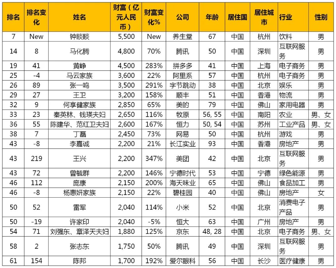而美团的王兴财富增长高达347%,成为中国前20大富豪中财富增长最快的企业家。宁德时代的曾毓敏、海天味业的庞康则凭借去年股价飙升双双跻身全球前50。