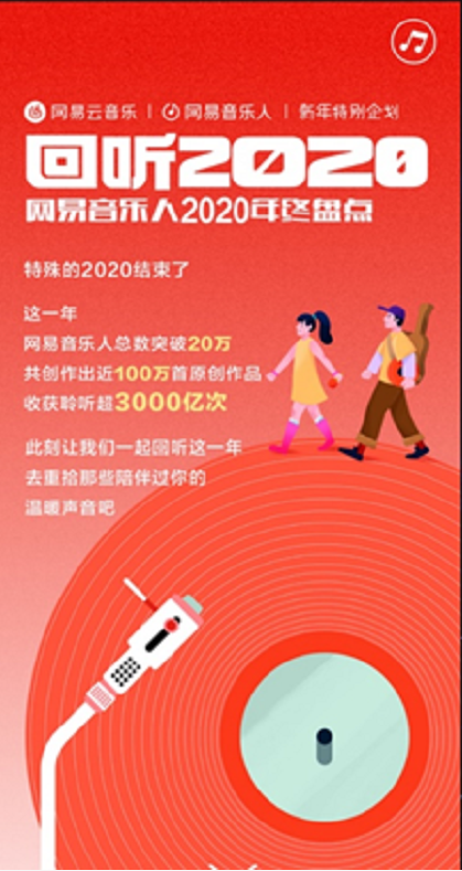 除了情感诉求和品质追求以外,00后也是极具个性的一代人,他们有自己独有的音乐品味,网易云音乐优质的原创音乐氛围具有较强吸引力。2020年网易云音乐平台涌现了众多爆款音乐作品。其中《错位时空》、《他只是经过》、《会不会》等歌曲更是成为年度短视频热门BGM。数据显示,网易云音乐入驻的原创音乐人数量超20万,去年一年新增近 100万首原创作品,原创作品年播放总量超 3000亿次。