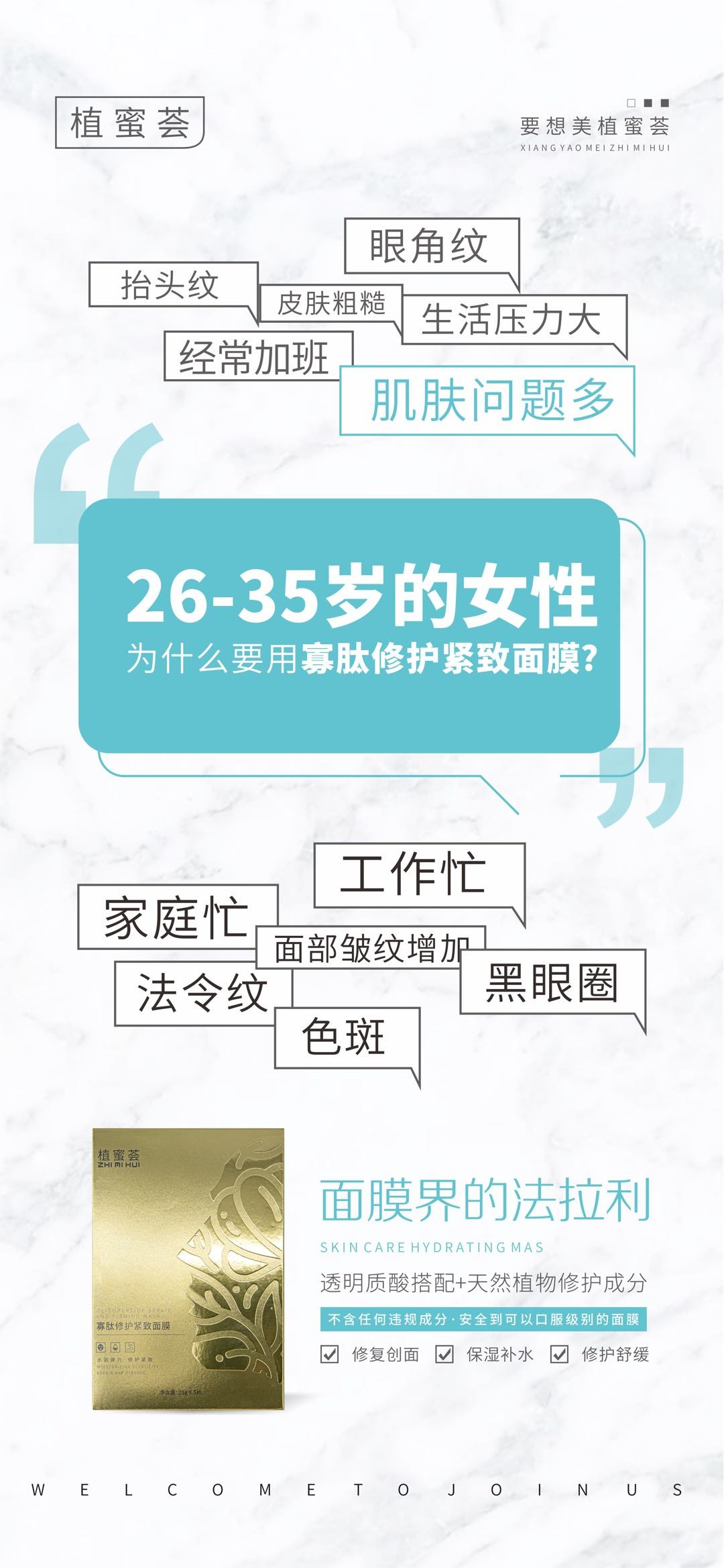 针对26-35岁女性的肌肤,深圳植蜜荟研发了寡肽修护紧致面膜,帮助女性应对来自工作忙、家庭忙带来的法令纹、色斑、面部皱纹增加和黑眼圈的难题。
