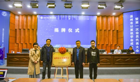大会举行隆重的揭牌仪式,省计算机学会秘书长肖俊、市科协副主席章秀伟、温州大学副校长薛伟、市民政局项佳磊共同为温州市计算机学会揭牌。