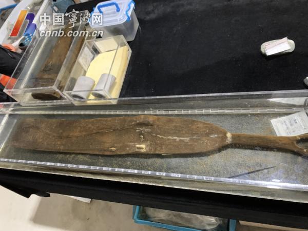 “井头山遗址靠海,先民的生产生活中,船桨起了非常重要的作用,库房里保存的一件木桨,是井头山遗址保存最完好的。与河姆渡遗址出土的几十件木桨不一样,这一件桨叶特别长,上面还有两个凸起。”王永磊说,船桨完全有近海航行的能力。
