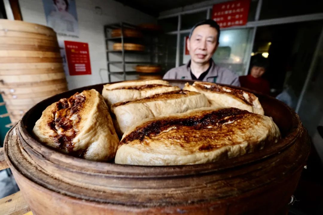 菜场西边这家以卖红糖发糕、白水洋馒头、油包而出名,老师傅笑说,刚开店时,生意清淡,现在不愁生意,每天都来不及做。