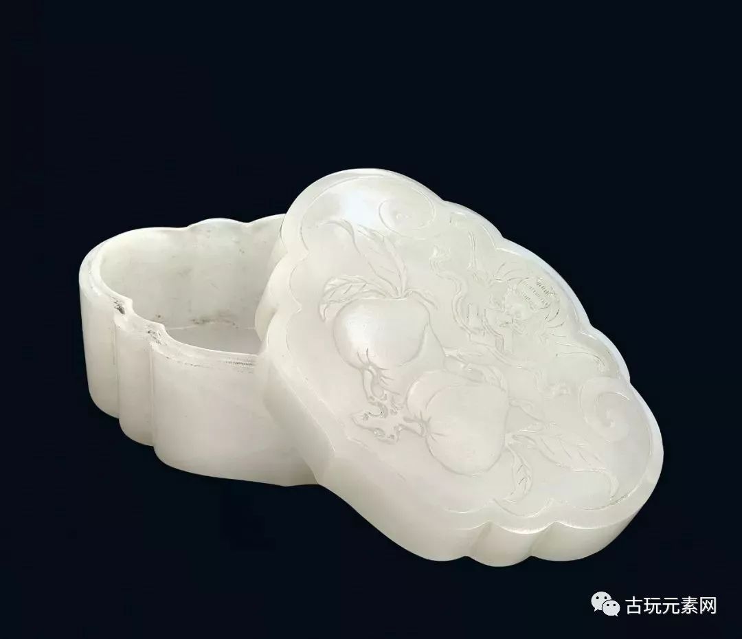 说明:印盒以整料和阗白玉雕成,胎体厚实,质地缜密,色泽洁白。通体呈如意形,造型雅致而不乏灵动,器物规整而不失新意。器分上盖与盒身两部分,以子母口相扣合。盖顶的如意形开光之内,琢饰福寿纹。其中蝙蝠形象生动,双翼展开,口中衔有一个万字符,寓意“多福”。两个寿桃丰硕饱满,枝叶繁盛,有“长寿”的吉祥寓意。盒壁面弧线优雅,内部掏膛干净利落,制作规整,琢磨精细,制艺徐疾有序,展示了制玉人的高超技艺和高超的智慧。盖与盒身薄厚均匀,且契合严密。整体造型沉稳简洁,与玉色素雅纯净相映成趣,格调高远脱俗,又不失灵动清新。印泥盒一般多为瓷胎烧制,以保持印泥的水分不致快速蒸散。而玉制印泥盒,则在材质上更加追求珍贵、奢华。印泥盒除了可置放印泥之外,事实上,也可以充作粉盒或香盒使用。