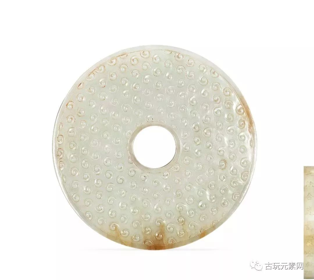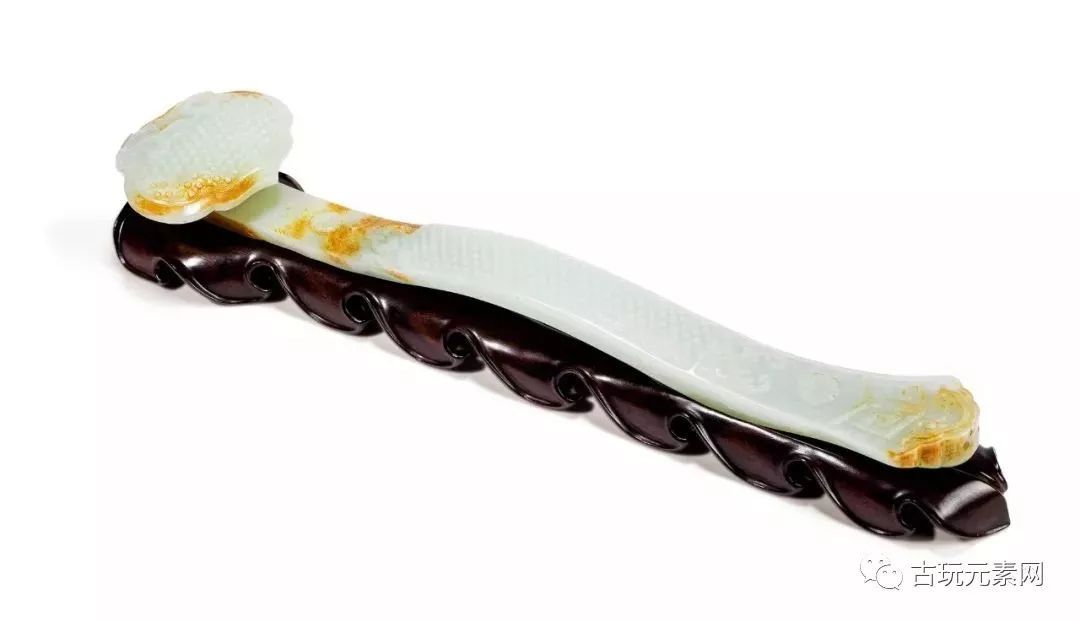 乾隆皇帝慕古、摹古,对于古玉尤为重视,除了广为搜集之余,更善于摹古,有如本品清乾隆 白玉仿汉谷纹云蝠如意。此柄如意主体以仿汉代古纹璧而琢制。据《周礼·春官·大宗伯》记载:“以玉作六器,以礼天地四方”,其中“以苍璧礼天”。璧在古代是标志诸侯爵位等级的瑞器。在周代,周天子称王,为最高等级,周王以下分公、侯、伯、子、男五个等级,每个等级的诸侯都有其特定的瑞器,不许僭越。据《刷礼·春官.大宗伯》记载:“以玉作六瑞,以等邦国。王执镇圭,公执桓圭,侯执信圭,伯执躬圭,子执谷璧,男执蒲璧。”子爵和男爵的等级用璧作瑞器,又以璧上所刻纹饰的不同而分为谷璧和蒲璧。谷璧的刻纹如发芽的谷粒状,有如本品之如意首及柄部之乳钉纹样。蒲璧的刻纹如蒲公英花芯上的斜网格状。此柄如意取上等和田白玉,材质硕大,玉质莹润通透,内含光华,入手温润,腻如琼脂。如意首呈灵芝形,开光内满琢仿汉代谷纹壁之乳钉,乳钉排列细密规整且颗颗饱满,刀工细致,打磨抛光精细。柄部于乾隆时期典型的巴洛克风格的花卉开光内亦琢乳钉纹,排列有序,密而不乱,于方寸中展示皇家之法度、威严,更体现了乾隆宫廷尊崇“汉玉”的师古之情。首部顶端亦采用高浮雕、镂雕之技法,雕琢蝙蝠展翅,口衔灵芝。由此观之如意背面,自如意顶至柄中部满饰云纹,层层叠叠,祥云氤氲。纵观本品,将汉代纹样与清代纹饰融为一体,摹古与创新,用刀讲究,一气呵成,起伏有致,舒展精致。特别是本品玉质白皙,巧用玉皮之栗色,摹古汉玉之沁色,实为匠心独运,整体给人以规制庄严之感,堪称乾隆玉制如意之佳器,殊为难得。