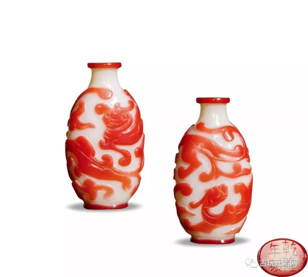 说明:烟壶呈扁瓶形,撇口,溜肩敛腹,底承椭圆形圈足。口底均满套粉料,壶身纤长扁平,此种器型的套料鼻烟壶为乾隆时期宫廷造办处制作样式之一。器形规矩典雅,俊秀可人,掌玩于手,喜悦于心。本品运用套料技法制成,通体涅白地套粉红色玻璃,响膛规整,料质纯净,白地温润莹白,冰泽明艳,抚之如凝脂,粉料颜色淡雅。通景饰螭龙纹饰,双螭龙腾空而起,叱咤风云,虬躯矫健凶猛,大有气夺千里之势,两龙神形俱佳,栩栩如生,相顾之际,更得以妙笔传示出浓浓的殷切之情。螭龙纹是我国古代常见的装饰题材,常用于各类器物之上,寓意吉祥,深得人们喜爱。平底上刻 “乾隆年制”四字二行楷书款,刀法流畅,是乾隆料器中的典型书体。Hugh Moss、Victor Graham 及曾嘉宝,《A Treasury of Chinese Snuff Bottles: The Mary and George Bloch Collection》,卷5,编号912,著录有一件清乾隆 涅白地套蓝料夔龙纹鼻烟壶,其用料、工艺、刻款相类,为同一时期制作的宫廷套料鼻烟壶,可兹比较。