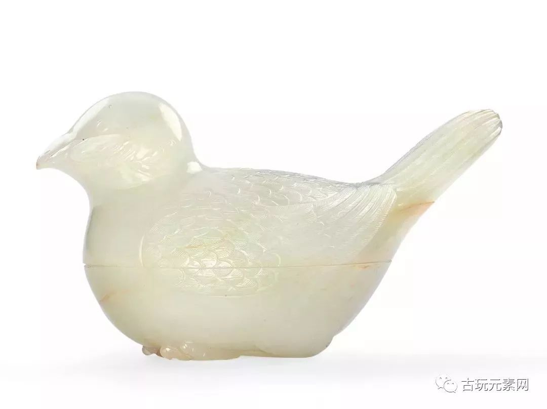 说明:盒以圆雕而琢,制者以喜鹊之身形巧琢香盒,玉色泽温润,鲜嫩可爱。喜鹊圆首尖喙,口衔灵芝,圆睛凸出,炯炯有神,羽翅丰满,鼓身翘尾,身形盈润,形象生动。盒内掏膛平整通透,气质可爱而文雅,造型和创意都颇具特色,刀工简洁,线条干净利落,工简而形神俱。香盒是古代女子储香之用器,常见题材以鹌鹑多见,而本品以人们喜爱的雀鸟—喜鹊为形做盒,构思巧妙,独具匠心,寓意吉祥。