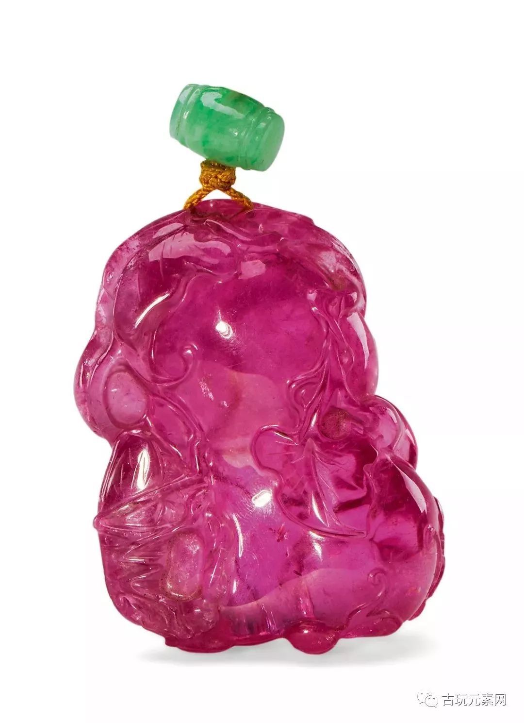 此件双桃红碧玺雕福禄万代坠设计精巧,用桃红红碧玺雕成螽斯栖息葫芦之上,巧妙别致,令人耳目一新。选料上乘,碧