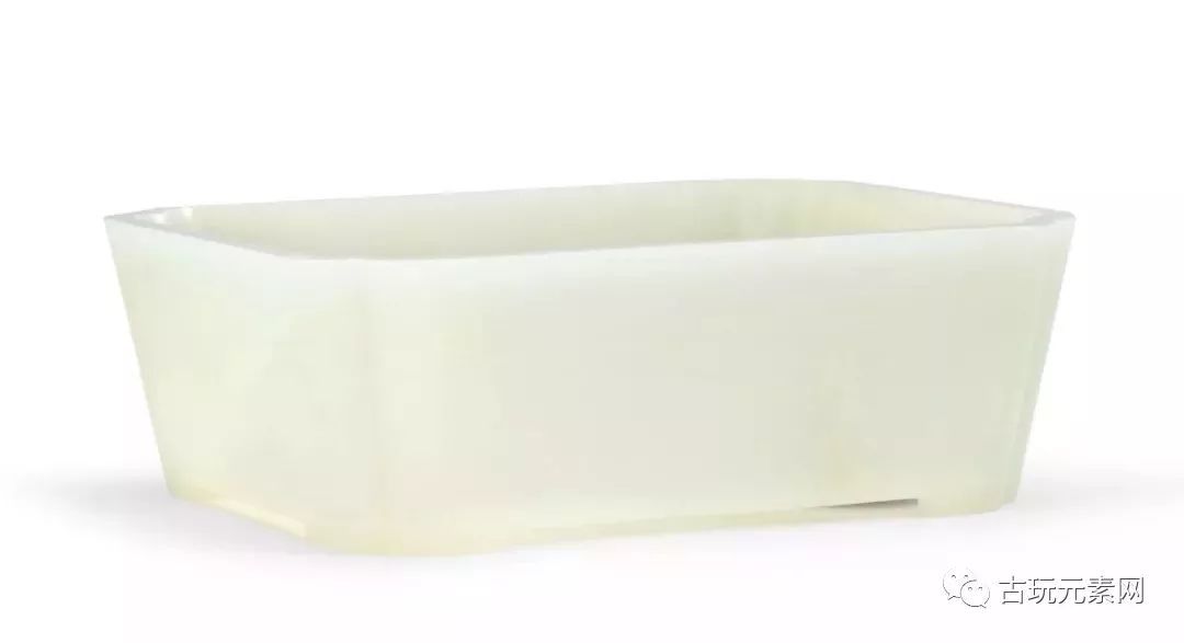 说明:洗呈长方形,整体线条流畅,从上至下整体收腰成一个长方的倒梯形结构,端正别致。底部挺立四个小足。通体光素,展示出简洁典雅的气度和珠圆玉润的质感。该器玉质纯净,莹润无瑕,质白细腻,玻璃感强,素雅秀美,充分显示出玉石的“体如凝脂,精光内蕴,质厚温润,脉理坚密”之本。