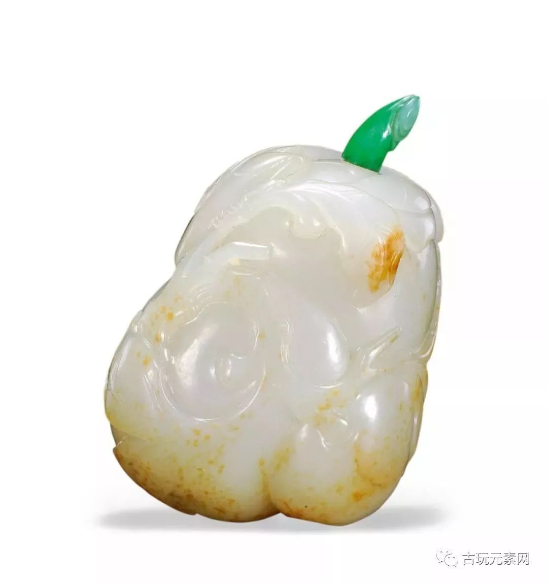 说明:烟壶取材上等和田白玉籽料雕琢而成,洁白纯洁温润的玉质一览无遗。其身形浑实丰厚,于璞于雕,半留本色,设计大胆而富有新意,琢磨干净,执握盈掌丰润圆滑,如握羊脂玉随,实不多得。此壶雕琢精巧,主体为“喜报三元”,别具情趣。三颗果实圆润饱满,枝干相连,花叶相属,脉络清晰,浑然一体。其间精雕一只喜鹊登枝,喜鹊雕琢颇为写实,阴线细刻羽翼,尖喙微张,作报喜之态。构图疏朗,线条饱满圆润,莹润美妙,玲珑可爱,造型优美秀丽,为乾隆年间洒金皮随形玉石烟壶之佳品。