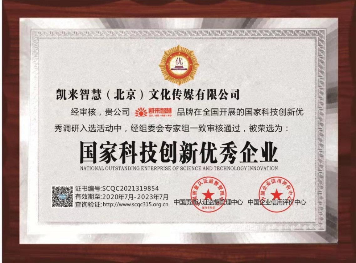 2020年7月,凯来智慧(北京)文化传媒有限公司,被中国质量认证监督管理中心和中国企业信用评价中心荣选为“国家科技创新优秀企业”,这个分量十足的荣誉,是对凯来智慧深耕教育培训事业多年的褒奖,更提升了凯来智慧的品牌影响力,凯来智慧(北京)文化传媒有限公司主要提供演讲、口才培训、线上教育、线上口才、企业经营、管理和演说等服务项目,在这方面有着雄厚的师资力量和独特的专业优势。