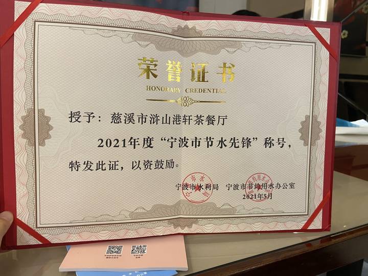 近日,宁波市节约用水办公室公布了2021年宁波市“节水行动十佳节水案例”和“节水先锋”名单,由慈溪市水利局选送的慈溪中科众茂环保热电有限公司荣获节水行动十佳实践案例,严兴军、慈溪市浒山港轩茶餐厅获评“节水先锋”,其中港轩茶餐厅为唯一获奖餐饮类企业。