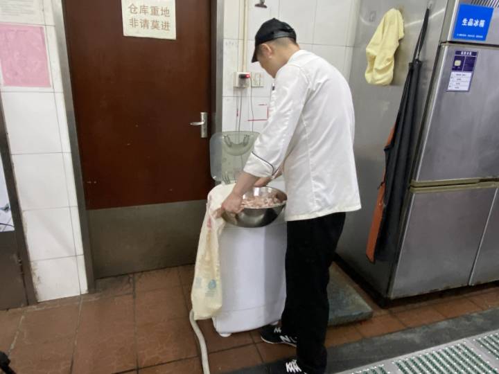 记者来到该餐厅后厨,只见一台洗衣机正在工作,冷冻排骨正在机身里面不停地被搅动清洗,几分钟后,洗得白亮的排骨端上了灶前。“相较于传统清洗方法,用洗衣机洗排骨只需要过去十分之一的水量,过去需要洗一个小时,现在只需10分钟不到,而且洗得更白亮、干净、卫生。”餐厅负责人介绍道。