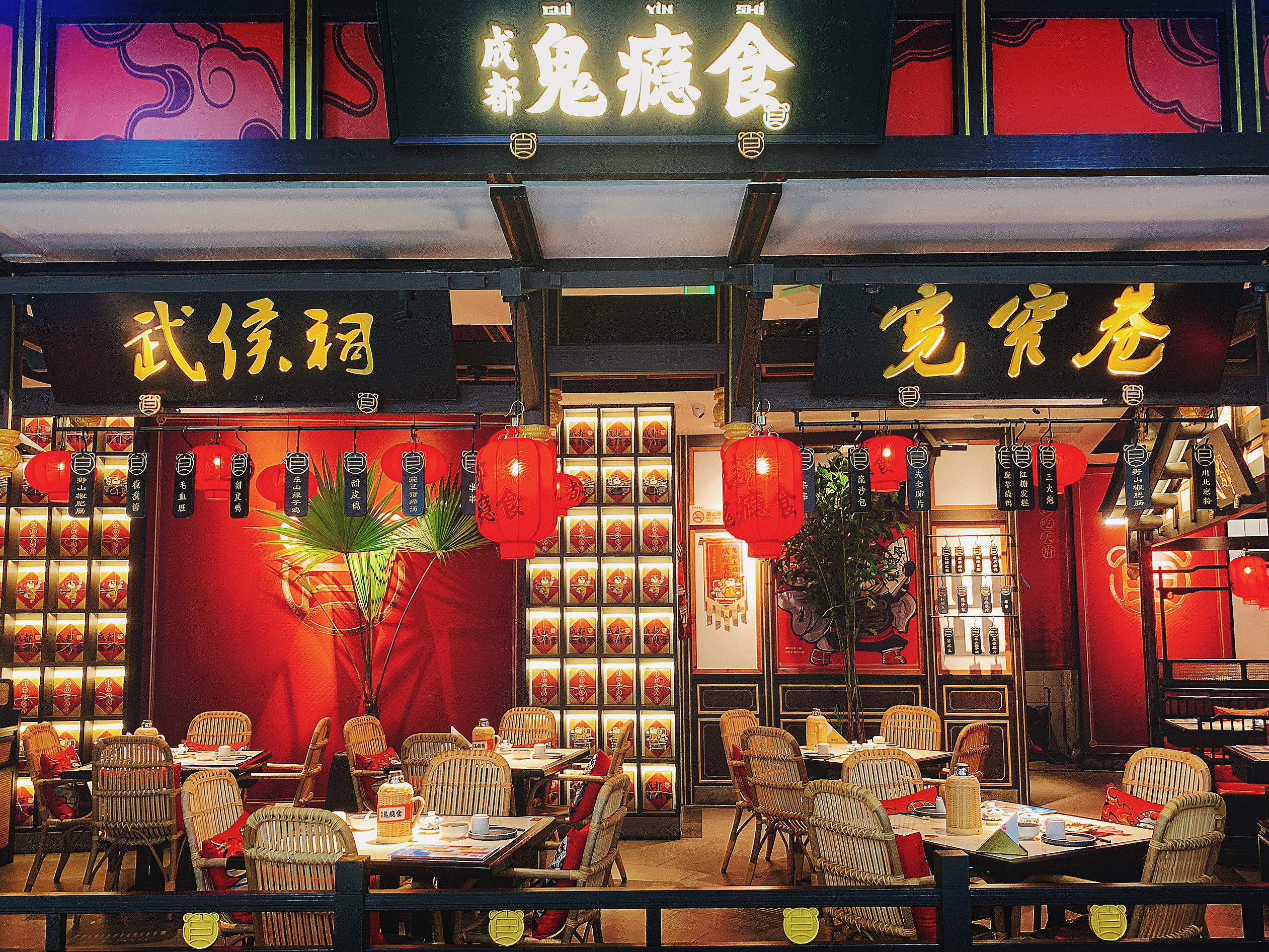 凭借大红灯笼、成都老街的同款藤椅,以及成都地名匾额等元素,“瑰瘾食”的店铺装修让食客仿佛一秒穿越到成都,热辣十足又不失舒适感,让食客不仅可以享受到正宗的川菜风味,还能在快节奏的都市生活中,寻得一个休闲放松的惬意场所。在火红的主色调中