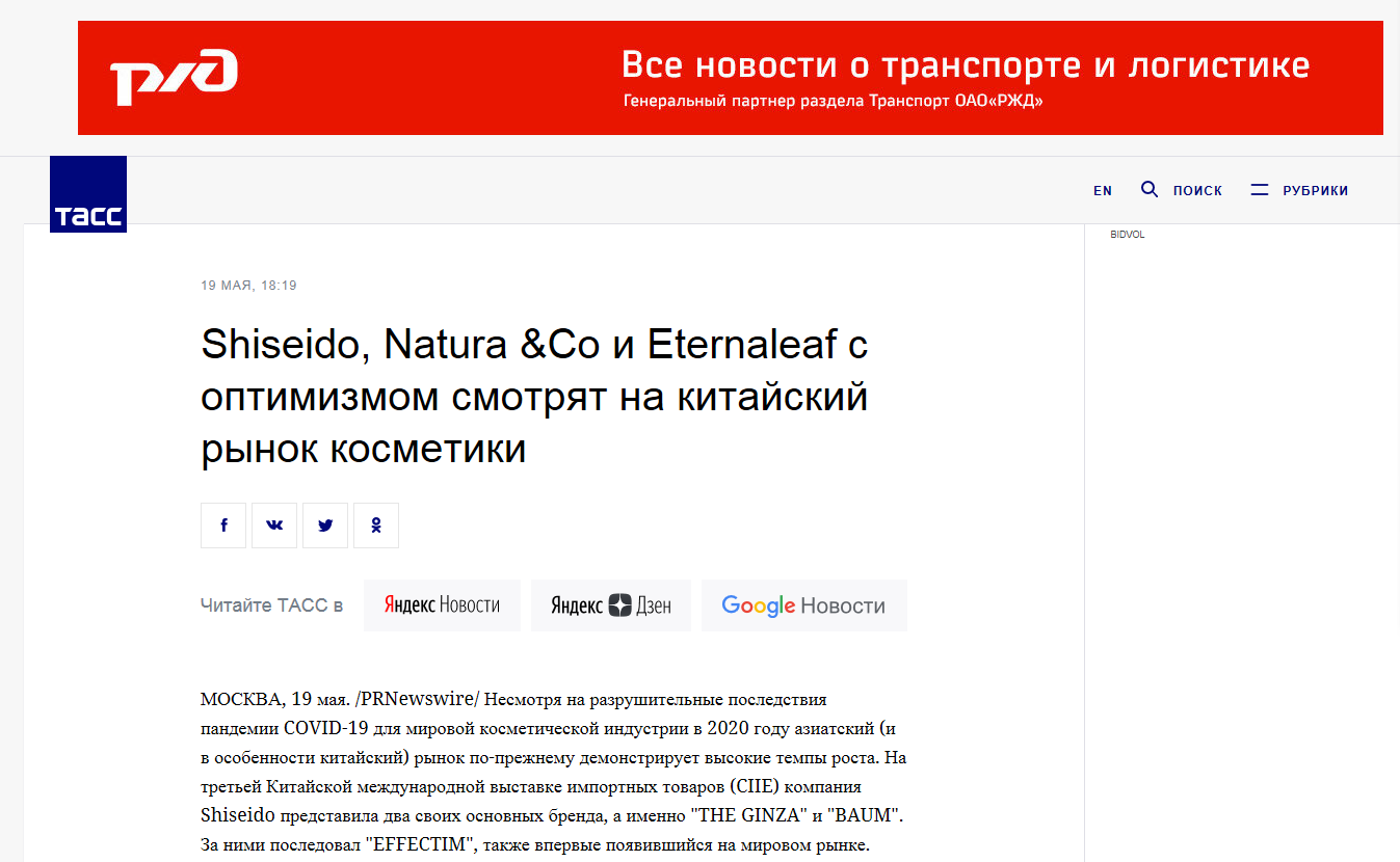 2021年5月19日/塔斯社/莫斯科电:《资生堂、Natura&Co和泊律诗Eternaleaf对中国化妆品市场持乐观态度》。全文摘编如下: